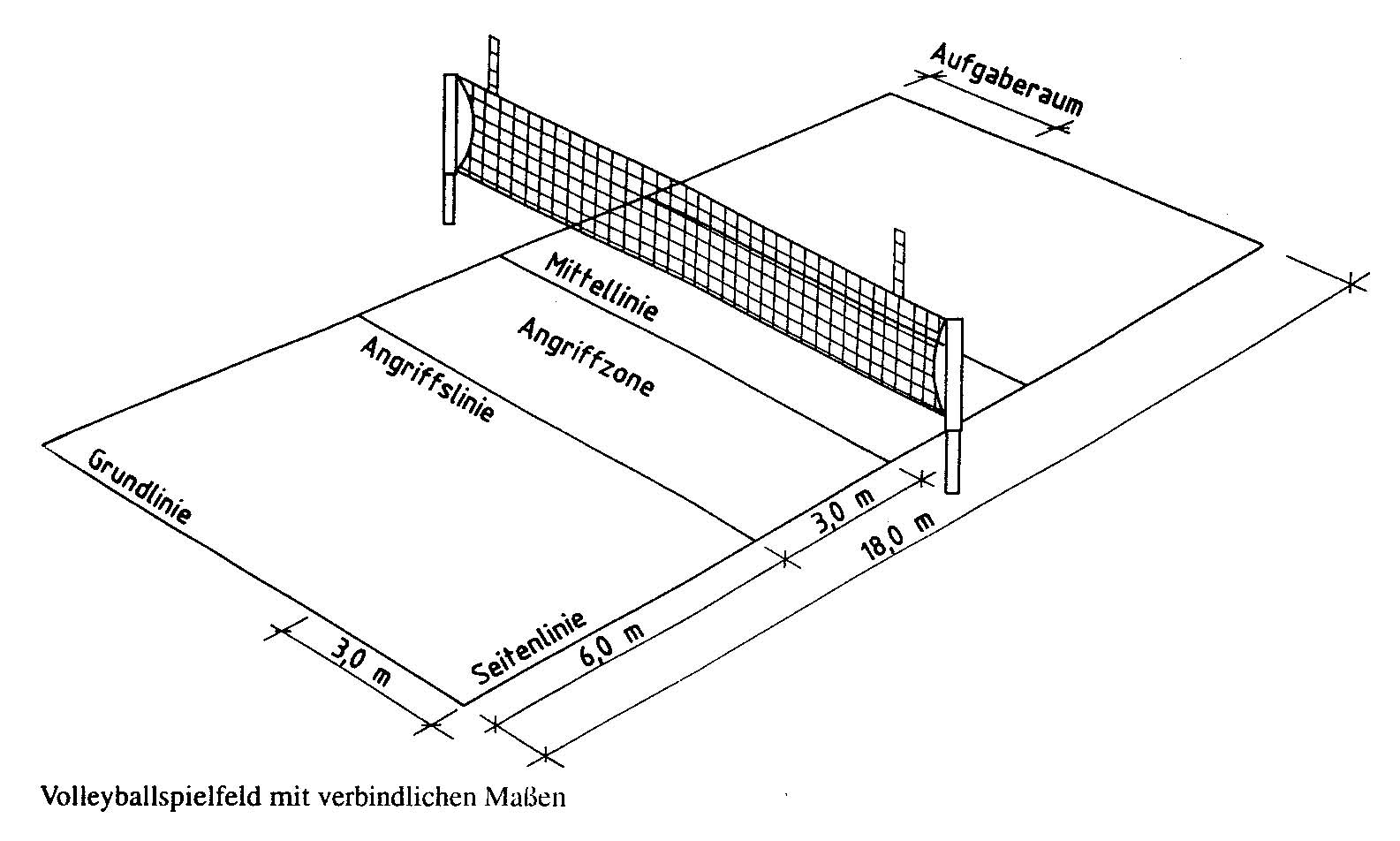 Das Spielfeld ist 18 x 9 Meter gross, getrennt durch ein Netz (Höhe: 2,43 m bei Männern, 2,24 m bei Frauen).